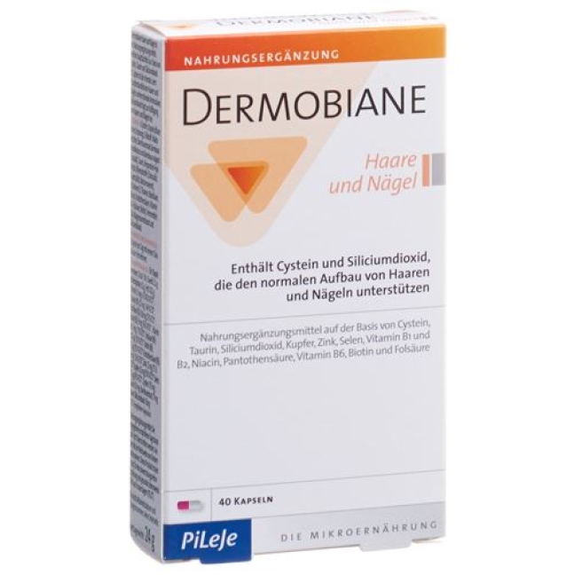 Которые Dermobiane волос и ногтей капсулы для поддержки здорового роста волос и ногтей и одновременно предотвращают повреждение клеток. Они содержат антиоксидант витамин е, а также биотин, медь, цинк, цистеин, таурин и бамбуковый экстракт.