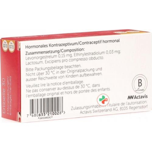 Erlibelle 30 - это гормональный контрацептив, так называемый комбинированный гормональный контрацептив (CHC) или таблетка. Каждая таблетка содержит небольшое количество двух разных женских гормонов, левоноргестрел в качестве прогестина (желтый гормон организма) и этинилэстрадиол в качестве эстрогена. Сертификат 30 является так называемым однофазным препаратом, поскольку все таблетки, покрытые оболочкой, содержат два гормона в равных количествах.