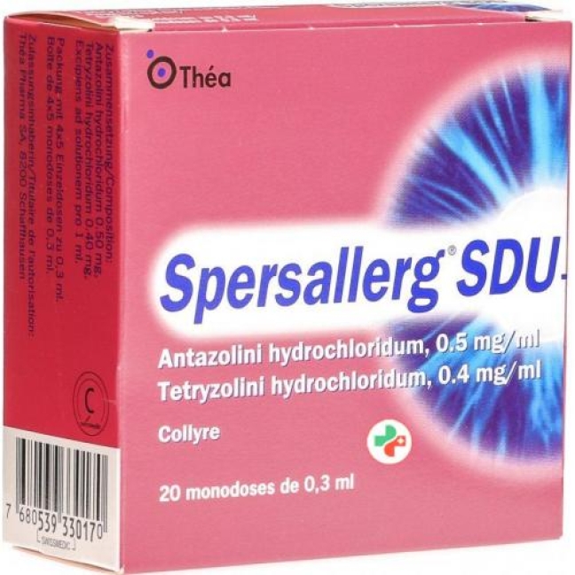 Сперсаллерг СДУ - глазные капли в одноразовых контейнерах. Они содержат антазолин, противоаллергическое средство, и тетризолин, сужающий кровеносные сосуды и снимающий покраснение и раздражение глаз. Сперсаллерг СДУ используется для лечения раздражений глаз, таких как конъюнктивит сенной лихорадки, весенняя аллергия и другие неинфекционные воспалительные симптомы глаз (например, от хлора или озона в воде плавательного бассейна). Сперсаллерг СДУ не содержит консервантов.